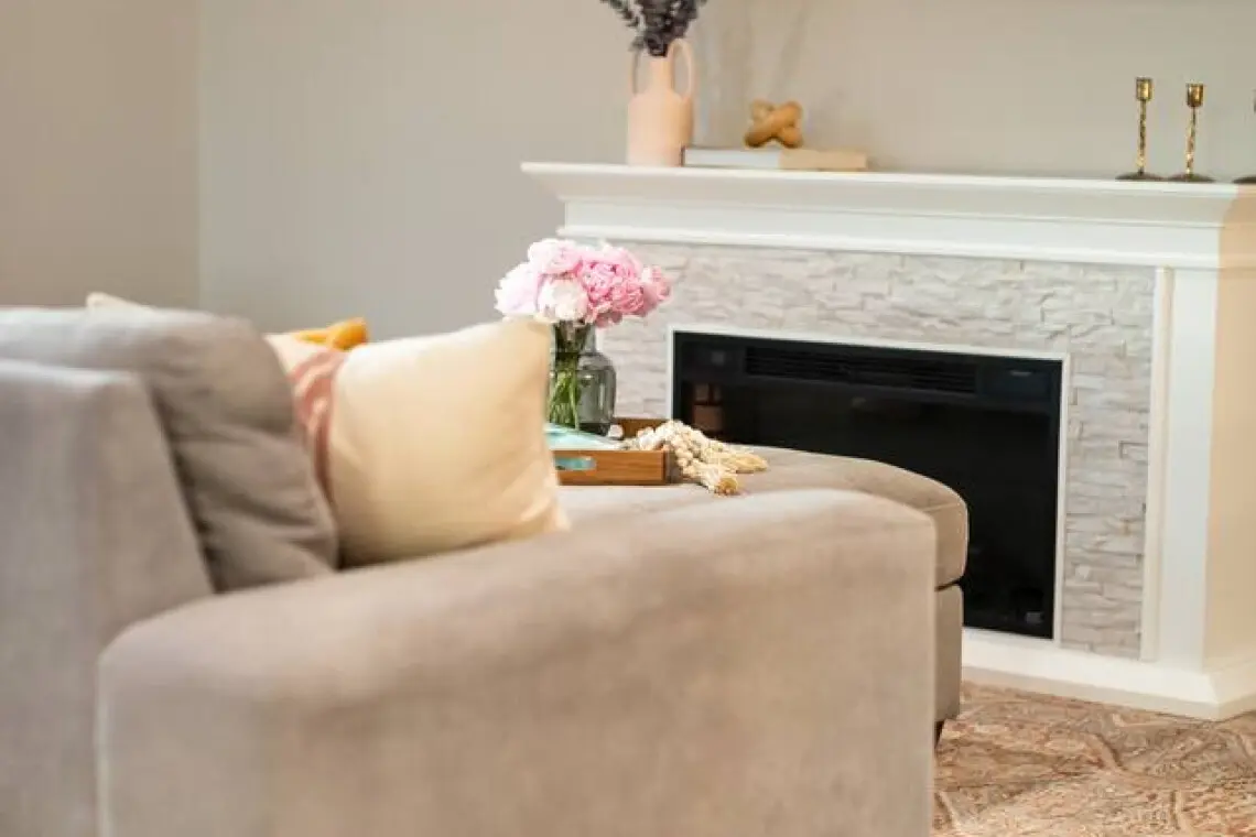INDOOR LIVING: Smart TV, electric fireplace, dining table, high chair